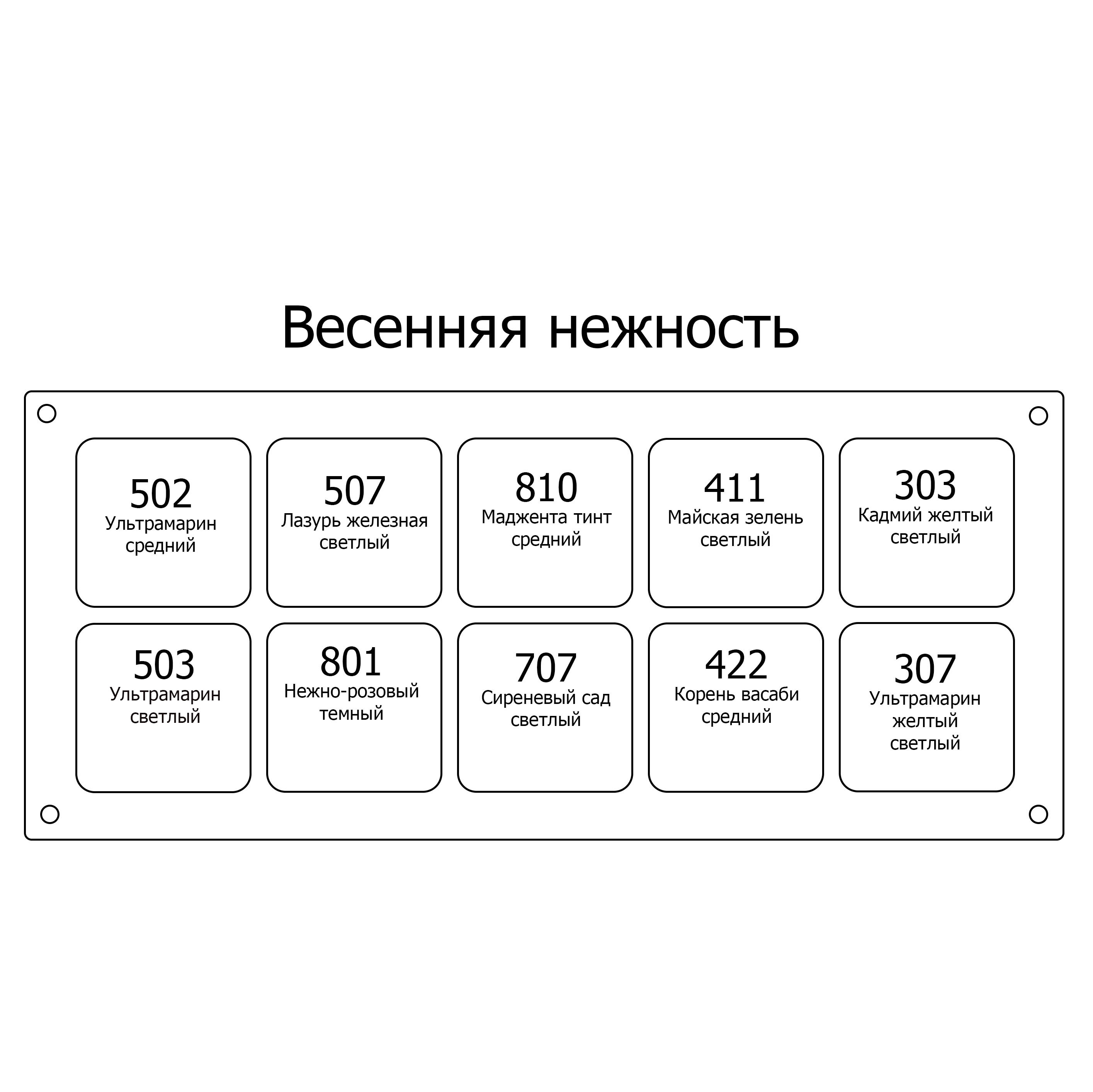 Палитра включает в себя наиболее востребованные цвета, которые легко смешиваются и тушуются между собой.